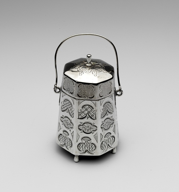 Zilveren waslucifersdoosje in de vorm van een achtkantige doofpot met hengsel. Versierd met ponsjes over het gehele oppervlak