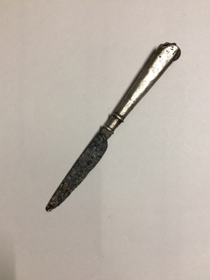 Mes met zilveren heft met opschrift: WAPKE GOITIEN DR.1688