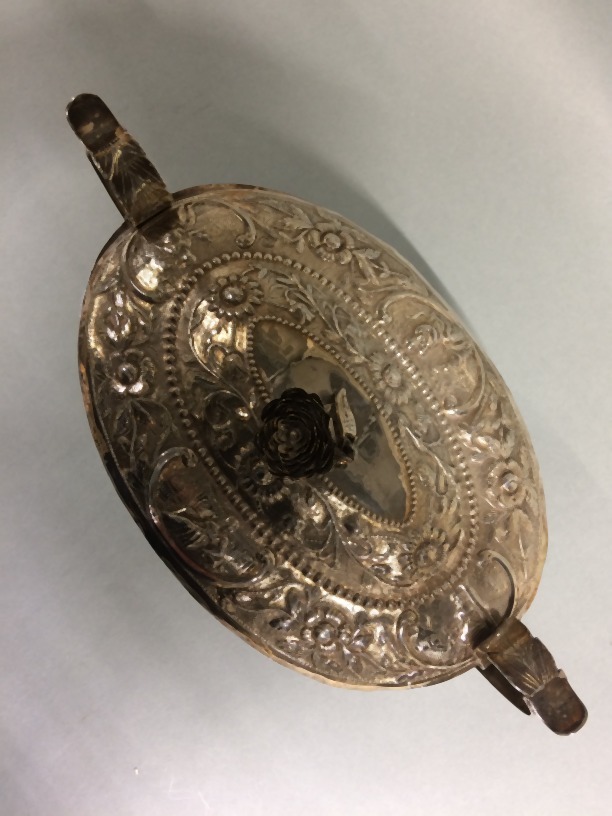 Twee-orig, van oorsprong zeventiende-eeuws zilveren kommetje waaruit brandewijn werd gedronken, maar in kerken wel wordt/werd gebruikt als collecteschaaltje. https://data.cultureelerfgoed.nl/term/id/cht/5d4501c2-bed0-47b0-8c7b-c8973d91084c