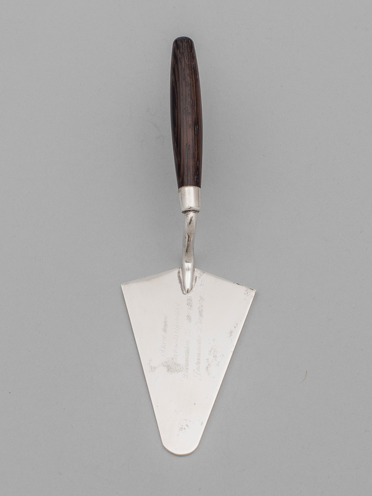 Een zilveren of verzilverde troffel is het ceremonieel metselgereedschap dat wordt gebruikt bij een eerste steenlegging. Een inscriptie op het blad verhaalt over de feestelijke gebeurtenis. https://data.cultureelerfgoed.nl/term/id/cht/5c199c82-f01f-467f-a8ec-0a1216554ac6
