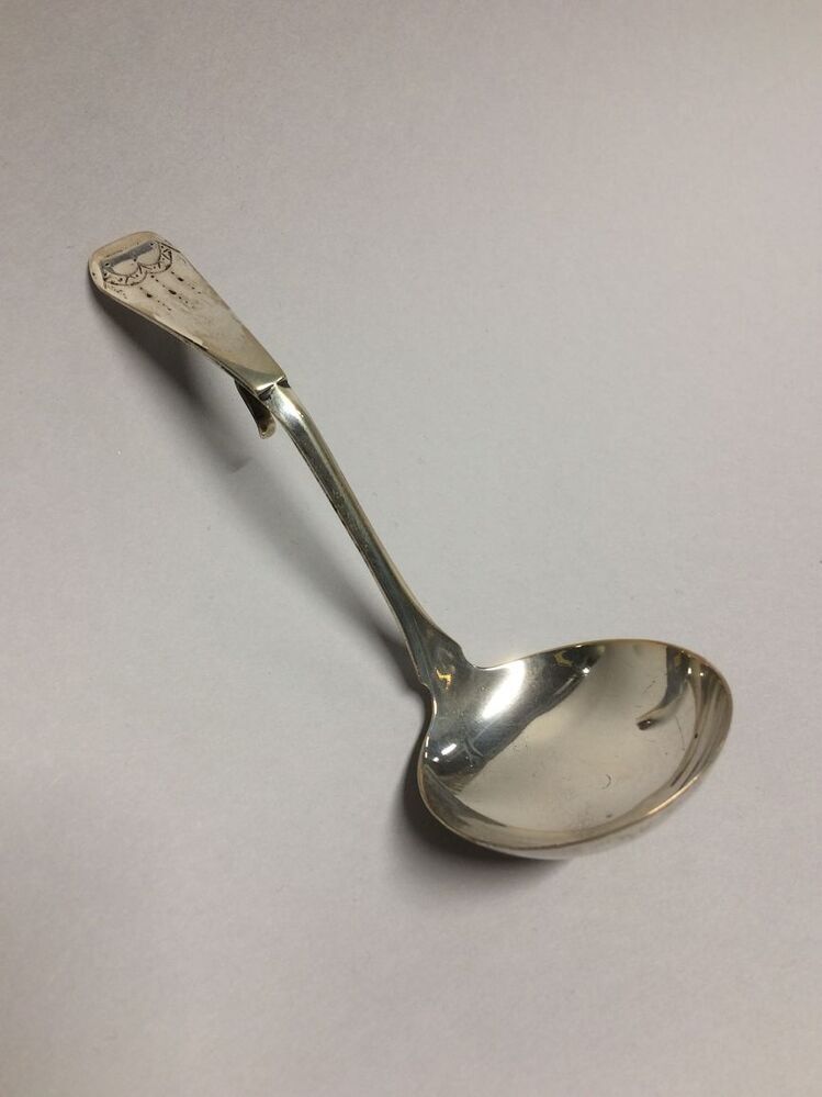 Eenvoudige roomlepel met ronde, onversierde bak en bovenaan steel gegraveerd ornamentje
