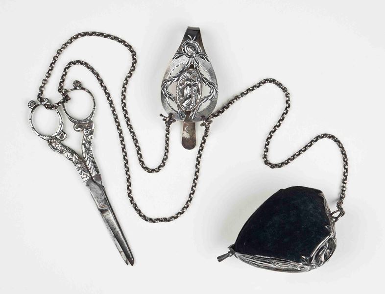 Zilveren chatelaine met schaar en speldenkussen aan haak, gemerkt TPT 1831