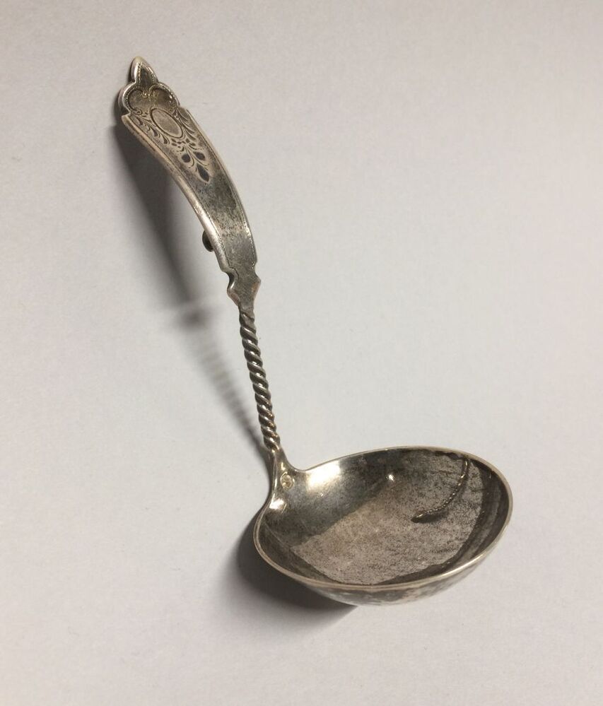 Roomlepel met bovenaan de steel een geponste versiering van een kleine ovaal met daaromheen versiering