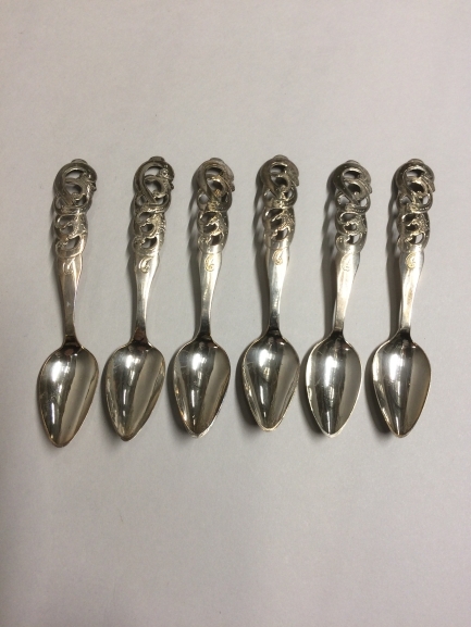 Zes theelepeltjes waarvan de steel is opengewerkt en een gegraveerde versiering heeft