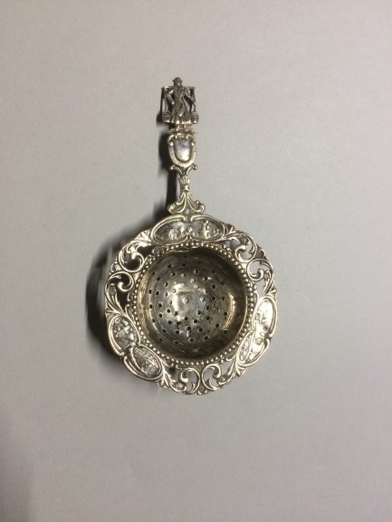 Theezeefje met op bovenzijde steel vrouwenfiguur die een juk met emmers draagt