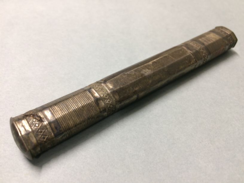 Zilveren naaldenkoker, achthoekig van doorsnede, met randen en ribbels