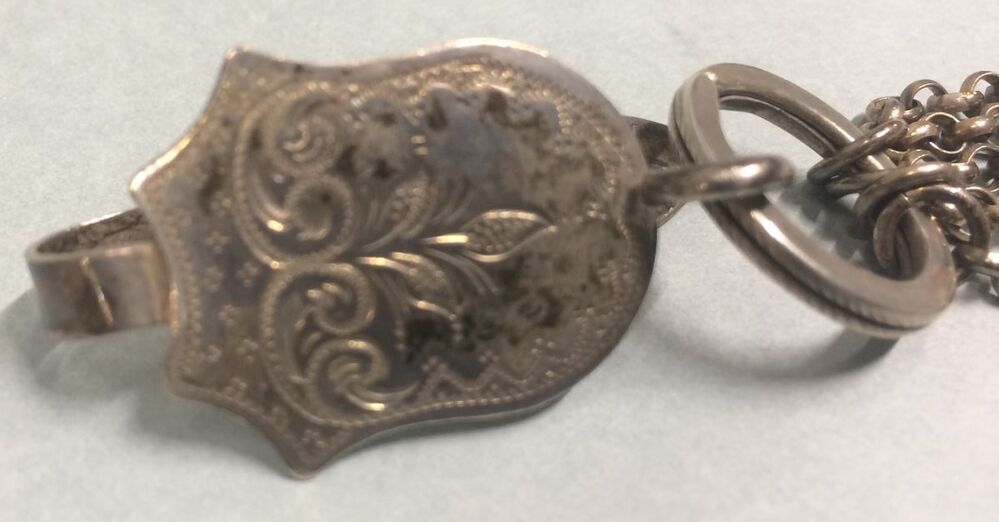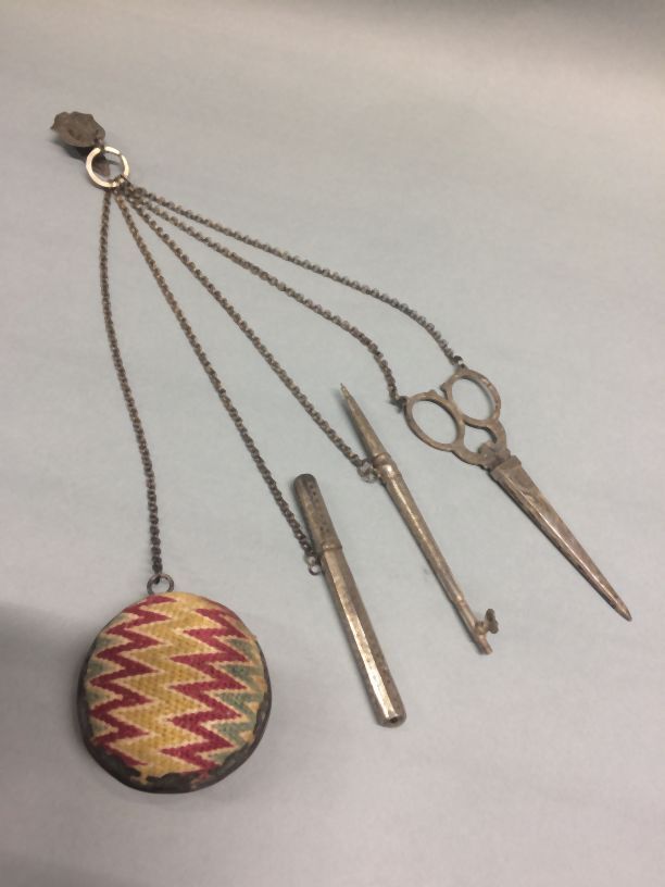 Chatelaine, zilveren haak en kettingen met speldenkussen, naaldenkoker, schaar met beschermer en haaknaaldshouder