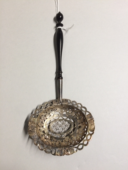 Suikerstrooier met ovale opengewerkte bak en houten steel