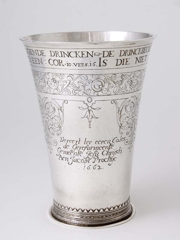 Kleine wijnbeker die wordt uitgedeeld aan iedere deelnemer aan het heilig avondmaal. De wijn wordt in het bekertje geschonken met de avondmaalskan. https://data.cultureelerfgoed.nl/term/id/cht/cd64ed8c-26c3-4312-b203-f2f5d81a6220