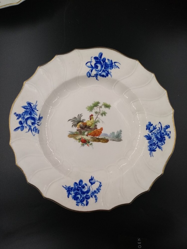 Groot plat bord met geschulpte rand en relieflijnen. In het midden decoratie in donkere pasteltinten van een vogelgroep op een stukje grond. Op de randen doornikse blauwe bloemen (onder het glazuur).