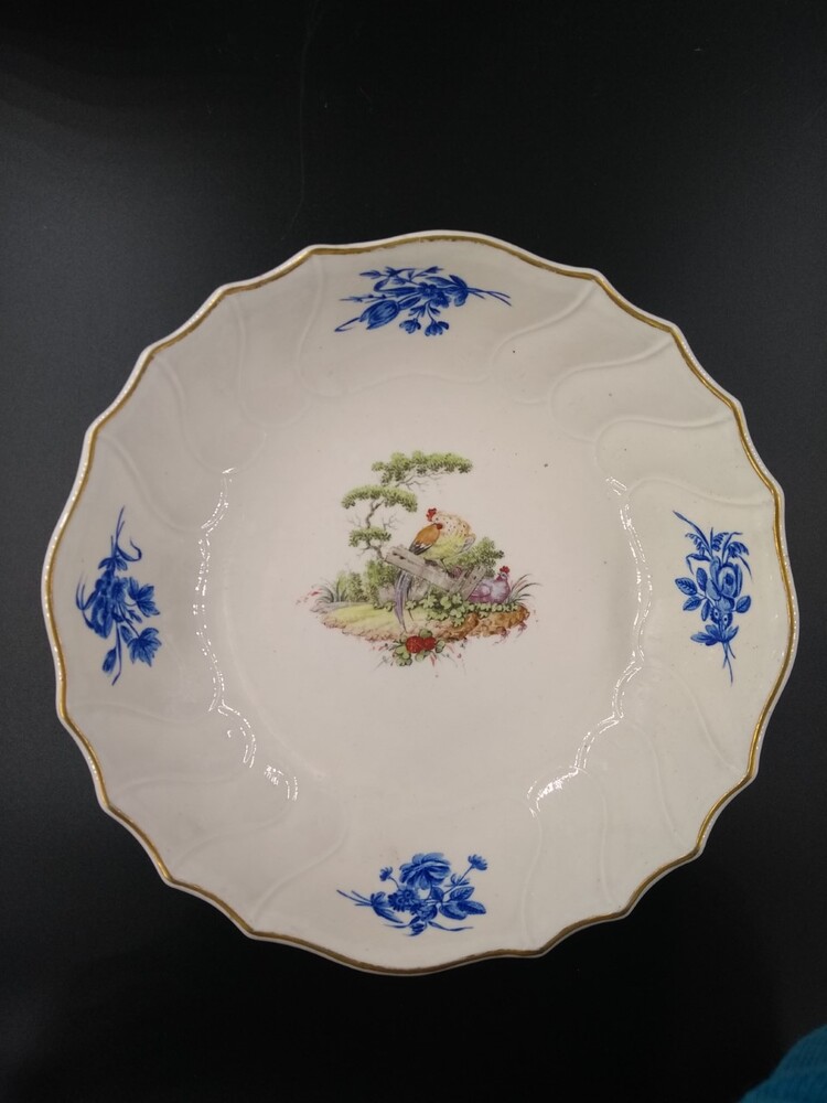 Diepe ronde schaal met geschulpte rand en relieflijnen. In het midden decoratie in donkere pasteltinten van een vogelgroep op een stukje grond. Op de randen doornikse blauwe bloemen (onder het glazuur).