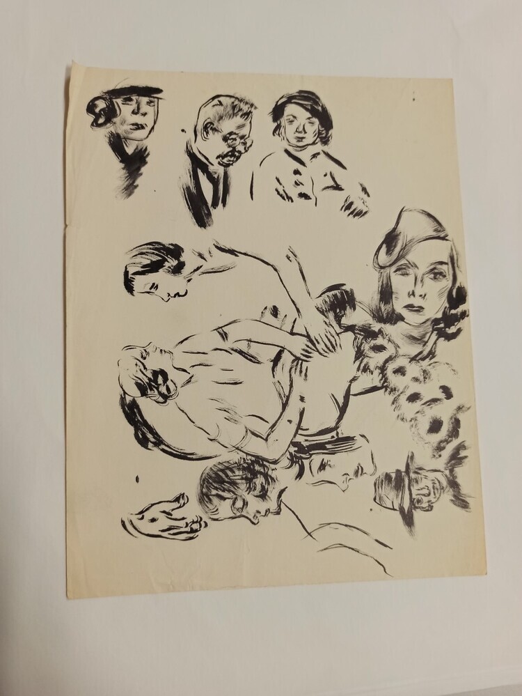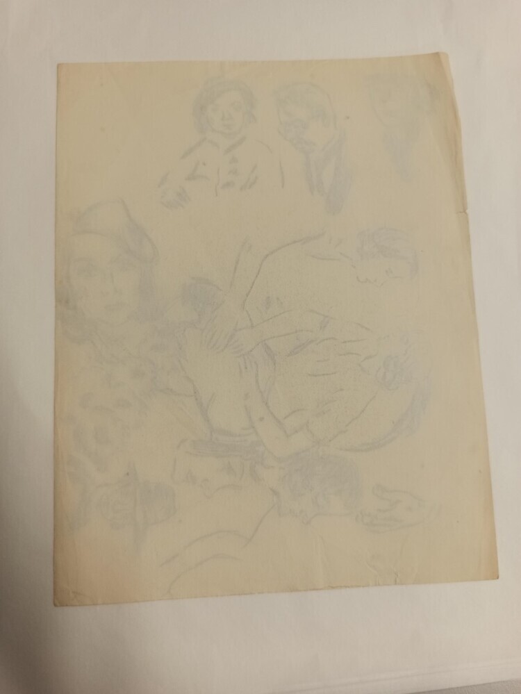 Op het papier zijn verschillende personen getekend. Zo zijn er gezichten van een oude man, een jonge vrouw en een man met hoed afgebeeld. Ook zijn er in het midden twee vrouwen afgebeeld. De ene vrouw zit en de andere vrouw legt een hand op haar schoot.
