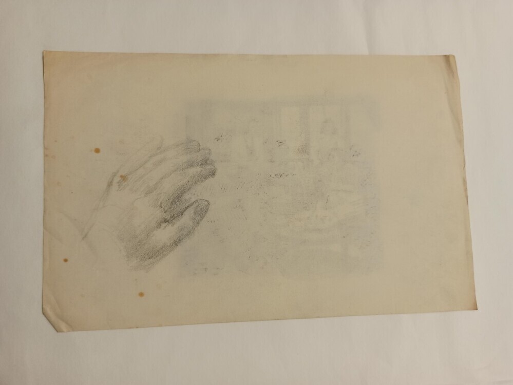 Op het papier is een woonkamerscène afgebeeld. Er zijn vier personen aanwezig in de kamer. Een vrouw zit op een bank en een bank zit onderuit gezakt op een stoel. Achter hen staan twee meisjes. Verder is de woonkamer knus en luxe ingericht. Op de andere zijde is een hand getekend.