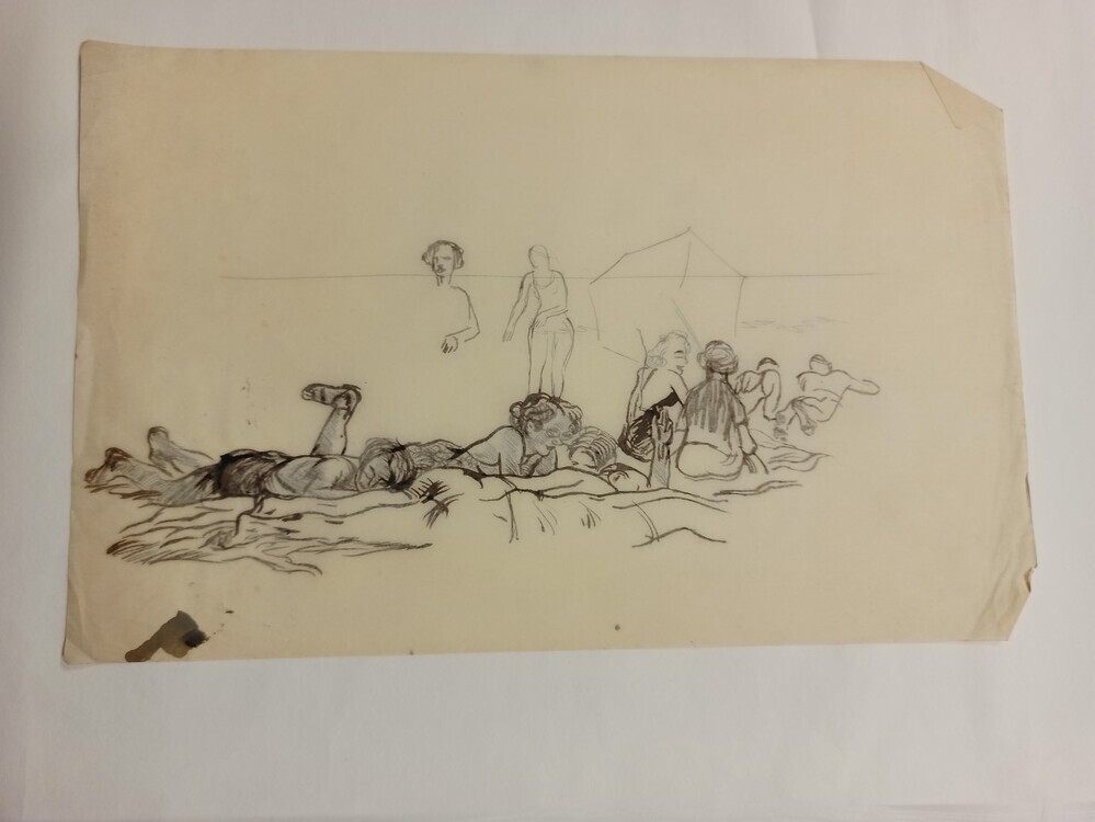 Op het papier is een strandscène afgebeeld. Verschillende mensen liggen in zwem- en zomerkleding op het zand. Twee vrouwen zitten te kletsen onder een parasol. Ook is met een enkele lijn de horizon aangeduid.