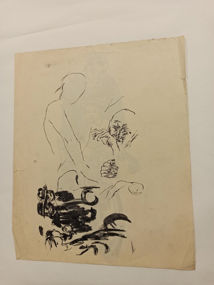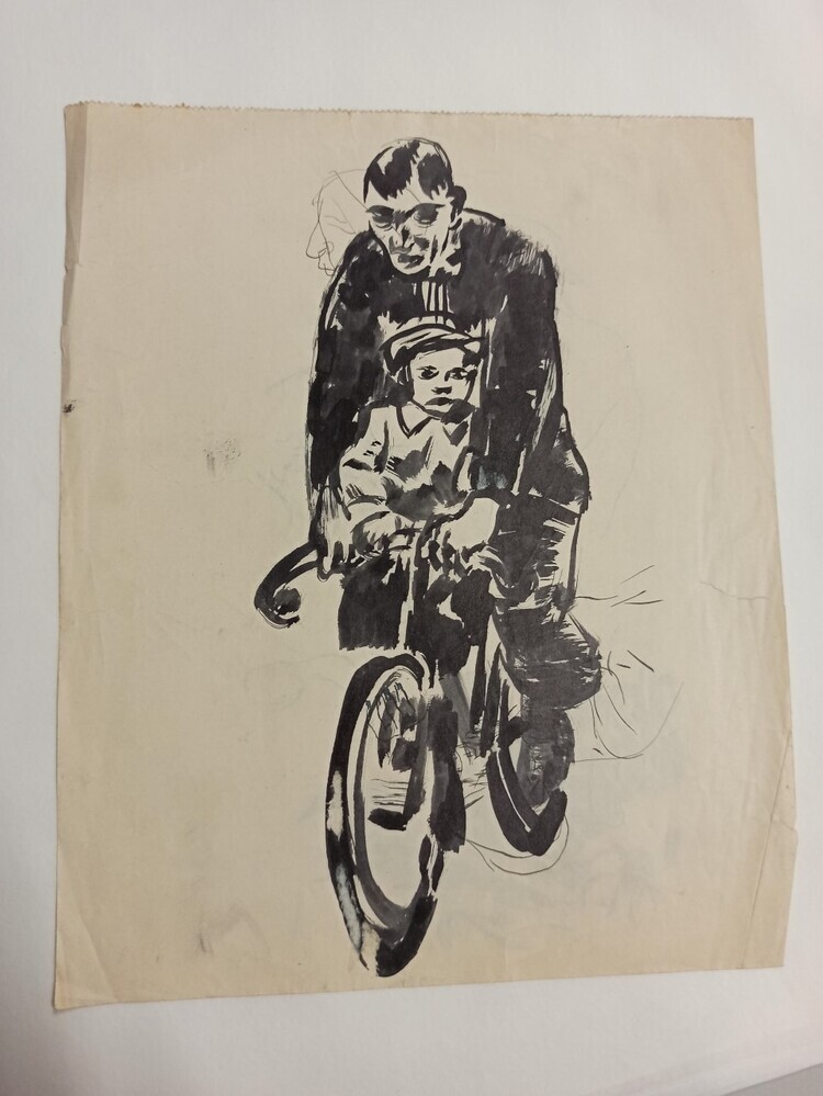 De beide kanten van het papier zijn gebruikt. Op de ene zijde is een man afgebeeld op een fiets. Op de stang zit een jongentje. De man is in het zwart en het jongetje draagt een pet. Op de andere zijde zijn meerdere figuren afgebeeld, waaronder een groep mannen met hoed.