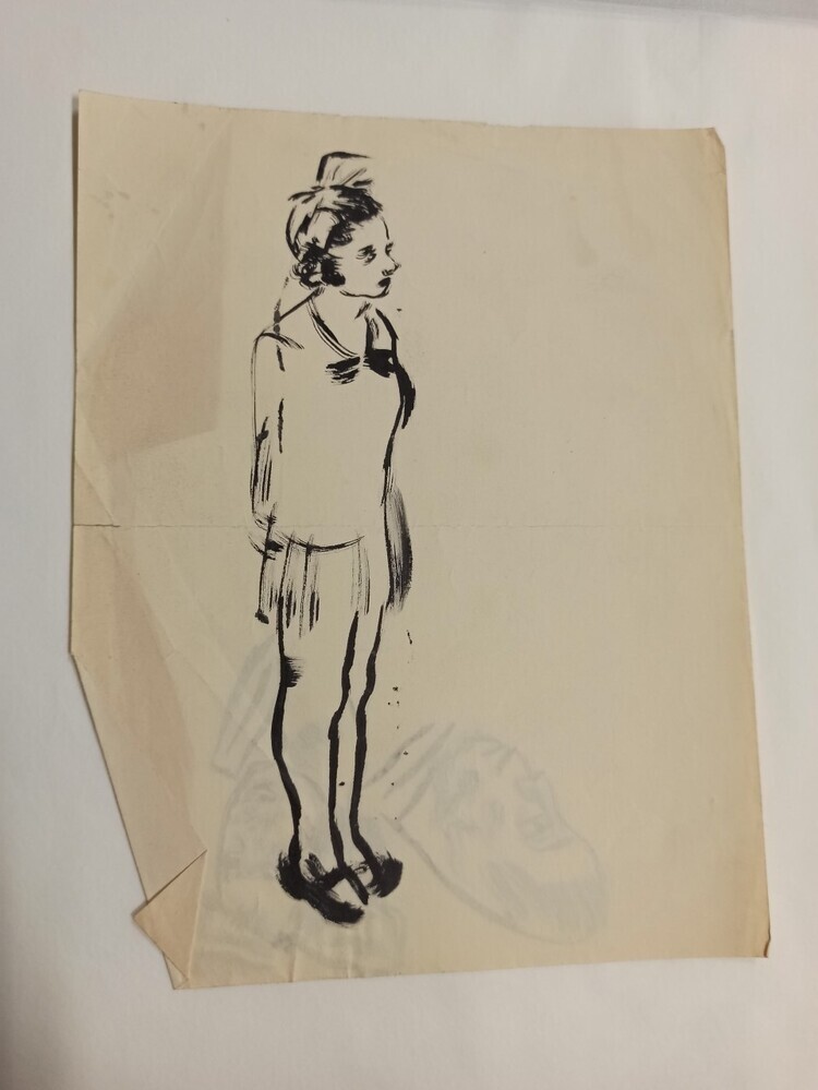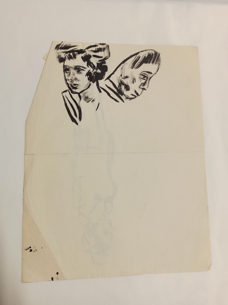 De beide kanten van het papier zijn gebruikt. Op de ene zijde is een vrouw of meisje getekend. Ze staat met haar voeten tegen elkaar aan met haar handen achter haar rug. Ze draagt een strik in haar haar. Op de andere kant zijn twee gezichten getekend.