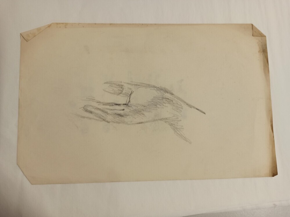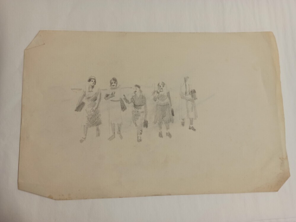 De beide kanten van het papier zijn gebruikt. Op de ene zijde zijn vijf vrouwen afgebeeld die op een rij lopen. ZZe lopen in korte mouwen met elkaar te praten. Op de andere zijde is een hand getekend.