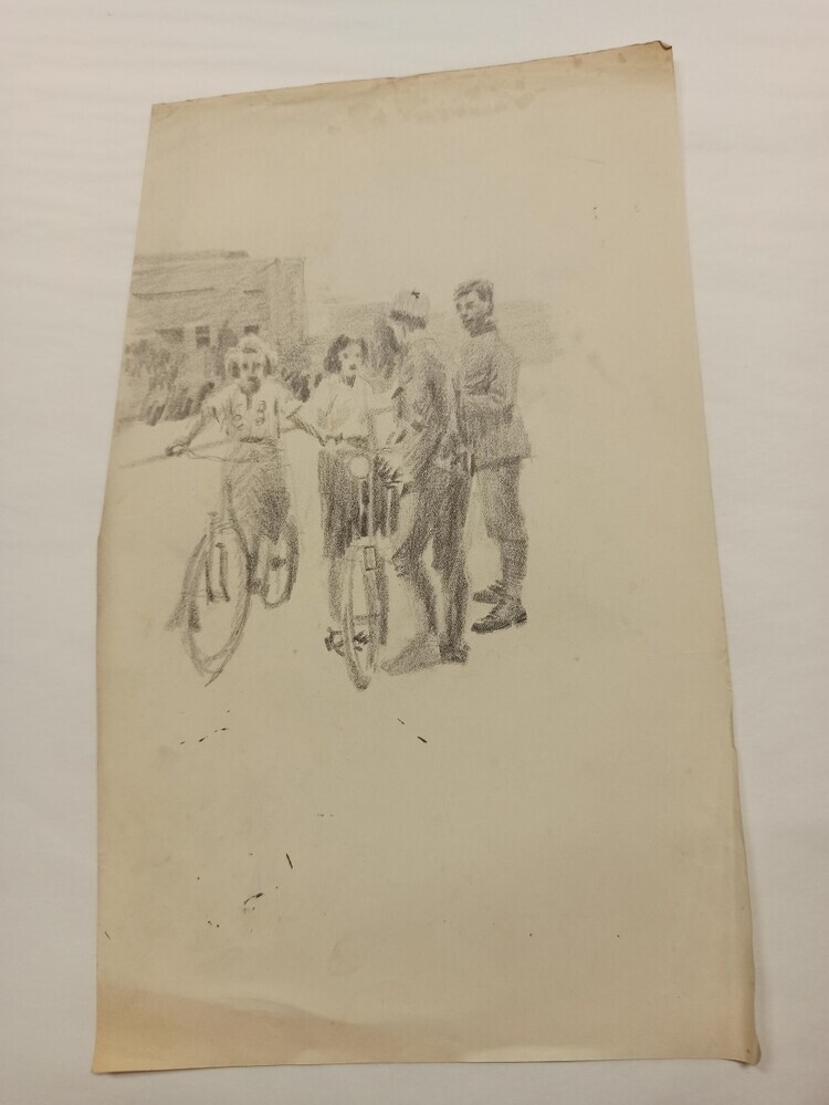 De voorstellling toont twee vrouwen die met de fiets aan de hand staan te praten met twee mannen. Ze staan op straat.
