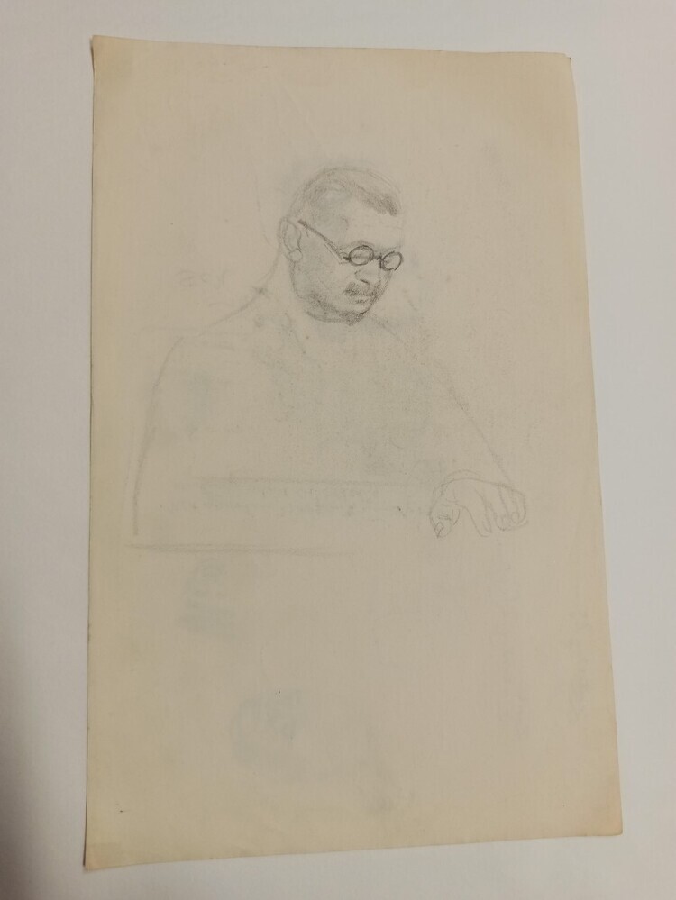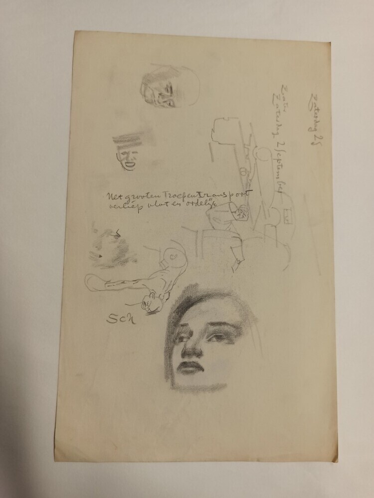 De beide kanten van het papier zijn gebruikt. Op de ene zijde is een oudere man afgebeeld. Hij draagt een ronde bril en kijkt met gebogen hoofd naar zijn handen. Op de andere zijde zijn verschillende aspecten getekend. Zo is er een vrouwen gezicht afgebeeld, een mannen gezicht, het silhouet van een politieagent en zijn ...
