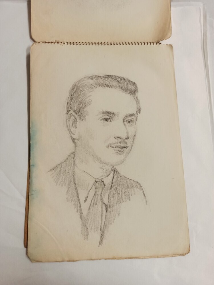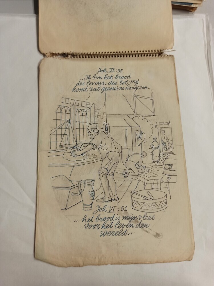 Het schetsboek is in zeer slechte staat. Hoogstwaarschijnlijk hebben er meer pagina's in gezeten. Nu zijn slechts drie bladen over. Op de eerste twee bladen is het portret van twee mannen getekend. Op het andere blad zijn twee bijbelteksten geschreven: Johannes 6:35 en Johannes 6:51. Tussen de teksten in zijn hard werkende mensen afgebeeld.