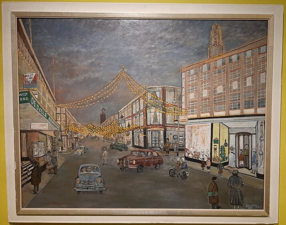 Momentopname van de Fahrenheitstraat bij avond. Drogisterij Nettesheim zit in het hoekpand aan de rechterkant. Links zat het West End Theater, waar op dat moment de film "De Dolle Generaal" liep.
