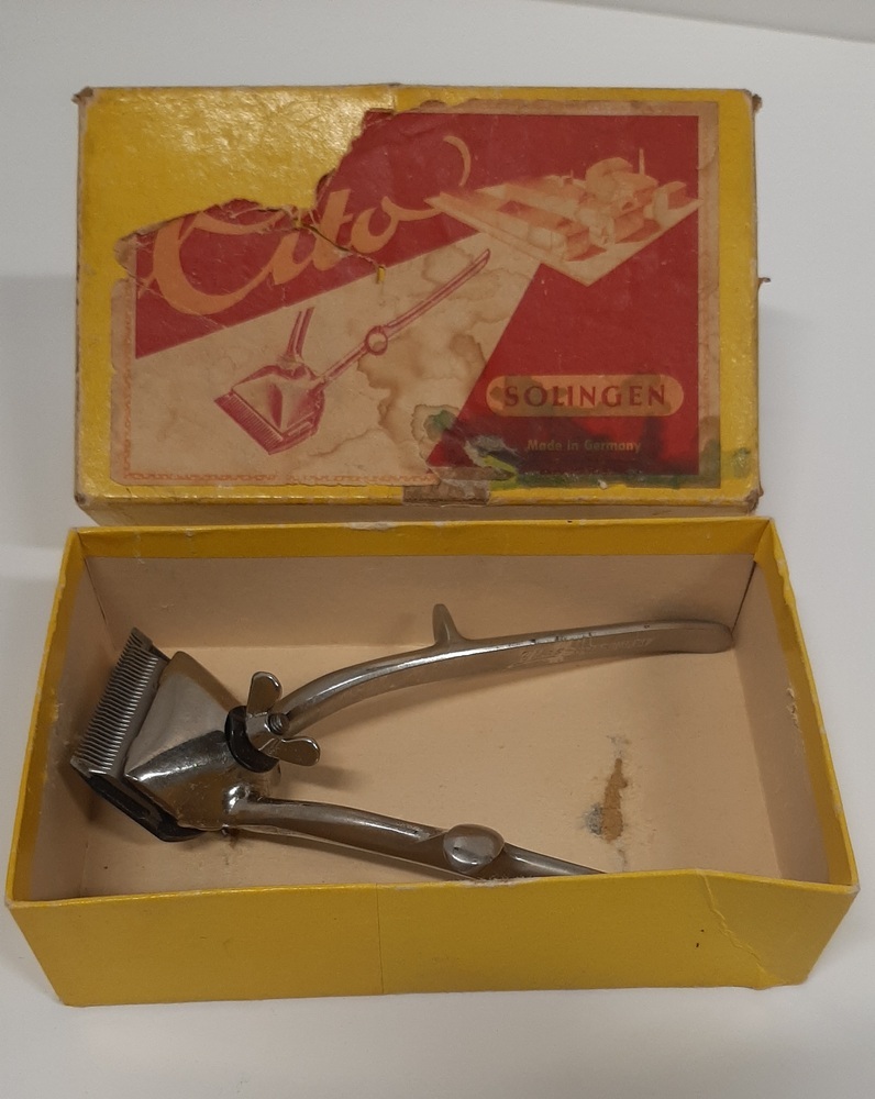 Op een gele kartonnen doos kleeft een rood, oranje, wit label. Er staat een tekening van een tondeuse alsook een drie-dimensioneel model van enkele gebouwen. Rechts onder staat "Solingen. Made in Germany". op de zijkant zit een etiket met "Cito". er is een kleiner etiket met 5.50 wat vermoedelijk verwijst naar de prijs. In de ...