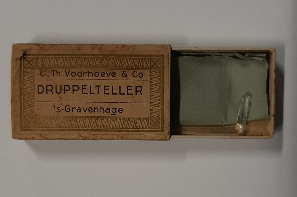 OP een kartonenn doosje, versierd met tekeningen van met rode bloemen, staat het opschrift "Druppelteller - C. Th. Voorhoeve & Co - 's Gravenhage". Wanneer je het doosje openschuift, ligt op groen papier een L-vormig glazen object.