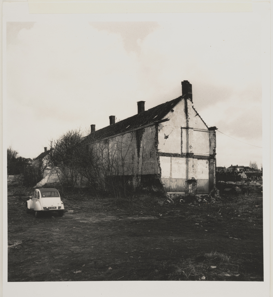In een kale omgeving staat één rijtje huizen overeind, waarvan een deel al gesloopt is. Links staat een witte auto geparkeerd.