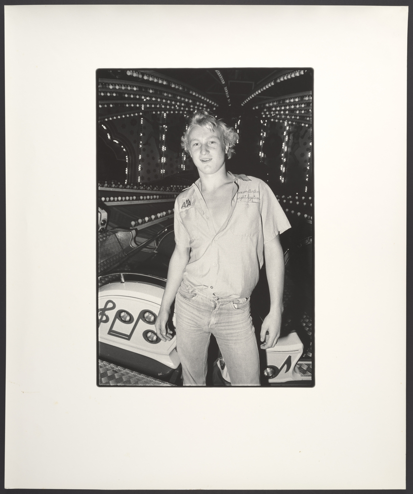 Voor een kermisattractie staat een jongen in een deels opengeknoopt overhemd en spijkerbroek zelfverzekerd voor de camera.