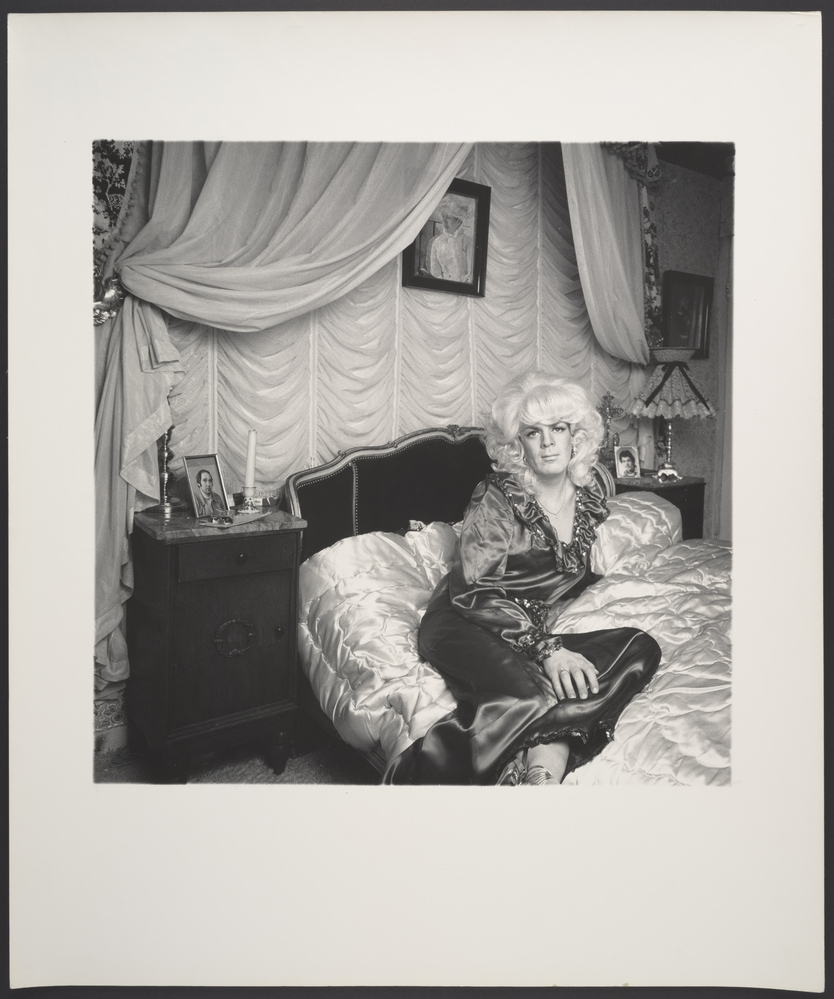 Op een bed dat uitgedost is met satijnen dekens, kussens en een geheel stoffen hoofdbord zit een persoon (Hanny) met een uitbundige pruik en glimmende hakken en een satijnen jurk. Hanny kijkt vanaf het bed naar de fotograaf en zit ontspannen.