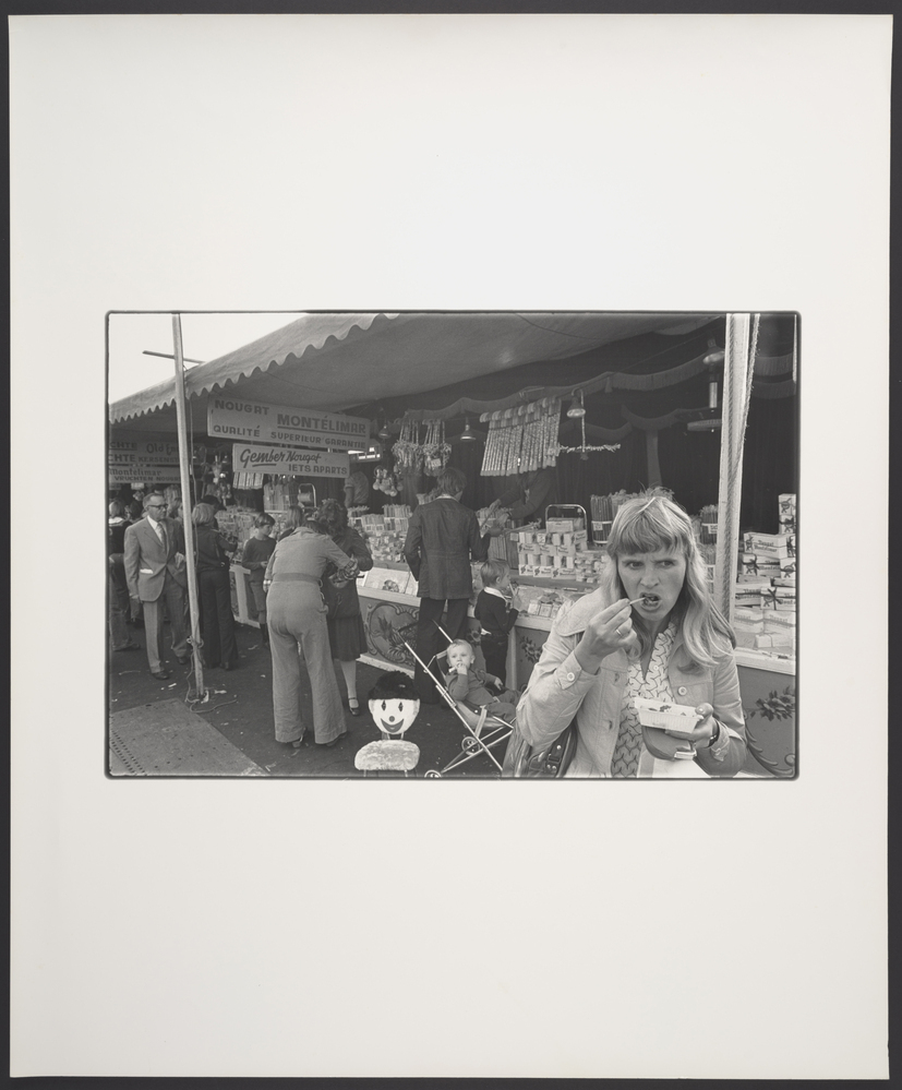 Op de foto is een marktkraam te zien waar verschillende mensen voor staan te wachten. Op de voorgrond eet een mevrouw met een pony iets uit een plastic bakje.