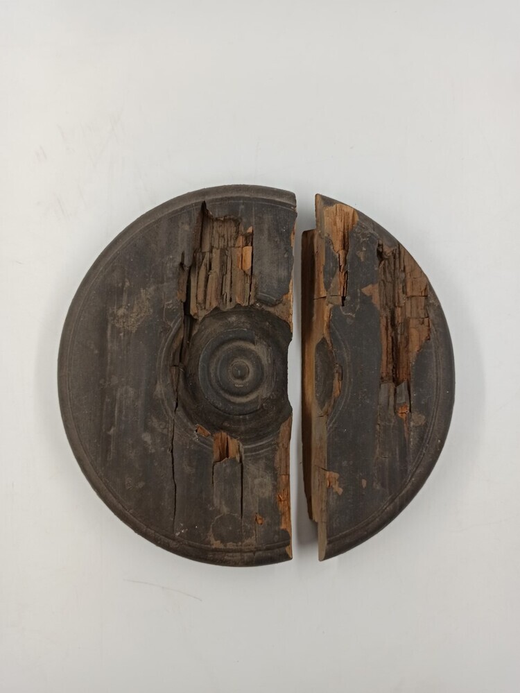 Houten deksel van een latrine uit een van de cellen uit de Gevangenpoort. Rond, met een gedraaide knop. Het deksel is gebroken in twee delen.