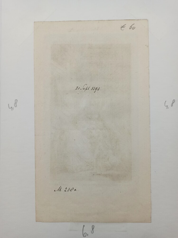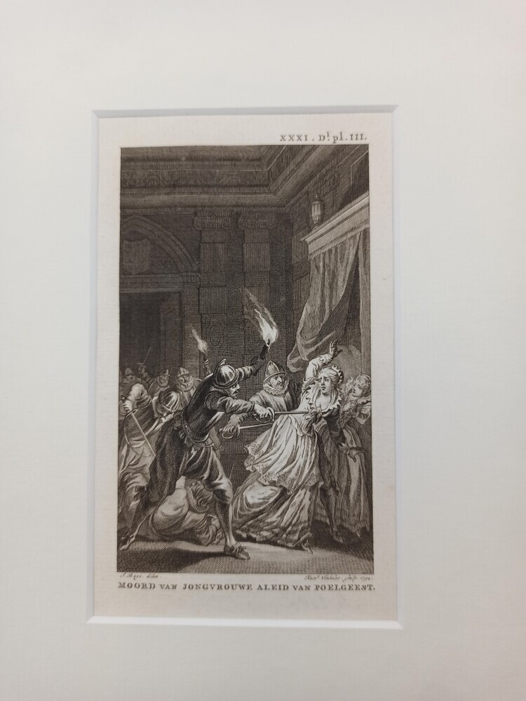 De prent is in de vorm van een staande rechthoek. Op de voorstelling is links een man afgebeeld die met een zwaard een dame aanvalt. De dame staat voor een groot bed en duikt weg, maar wordt toch geraakt. Het tafereel wordt verlicht door de fakkel in de hand van de man. Op de achtergrond ...