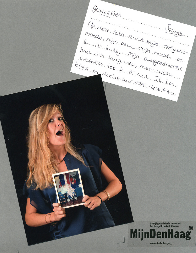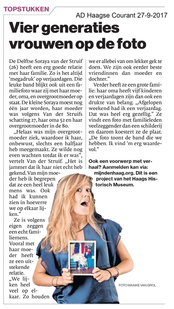 Dit verhaal maakt onderdeel uit van het project MijnDenHaag* Topstukken, waarbij Hagenaars gevraagd wordt naar hun eigen persoonlijke topstuk. 'Generaties Op deze foto staan mijn overgrootmoeder, mijn oma, mijn moeder en ik als baby. Mijn overgrootvader had niet lang meer, maar wilde wachten tot ik er was. Ik ben trots en dankbaar voor deze foto. ...