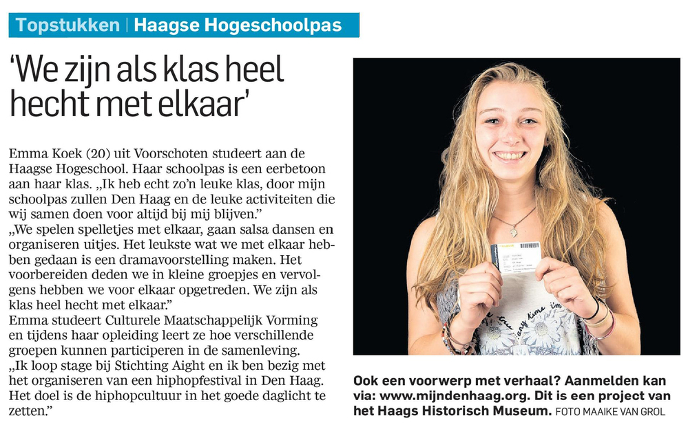 Dit verhaal maakt onderdeel uit van het project MijnDenHaag* Topstukken, waarbij Hagenaars gevraagd wordt naar hun eigen persoonlijke topstuk. 'De Haagse Hogeschoolpas is erg belangrijk voor mij geworden omdat ik zulke leuke mensen heb ontmoet op mijn opleiding Culturele Maatschappelijke Vorming. Den Haag zal mij hierdoor voor altijd bij blijven! Emma Koek'