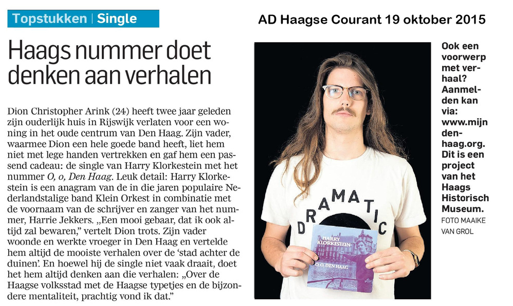 Dit verhaal maakt onderdeel uit van het project MijnDenHaag* Topstukken, waarbij Hagenaars gevraagd wordt naar hun eigen persoonlijke topstuk. 'Dion Christopher Arink O, O, Den Haag.... Muziek over Haagse trots, herinneringen aan Haagse plaatsen en vervlogen tijden. Mooie stad achter de duinen. D.C. Arink'