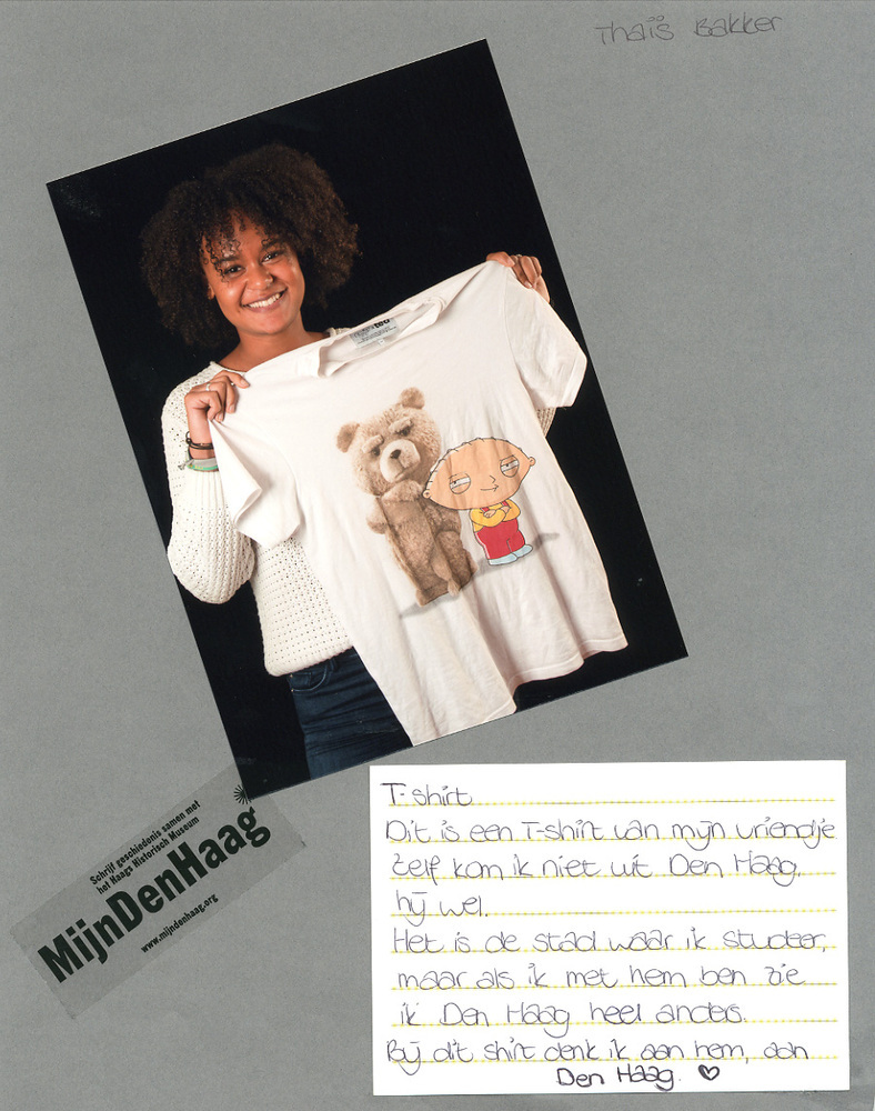 Dit verhaal maakt onderdeel uit van het project MijnDenHaag* Topstukken, waarbij Hagenaars gevraagd wordt naar hun eigen persoonlijke topstuk. 'T-shirt Dit is een t-shirt van mijn vriendje. Zelf kom in niet uit Den Haag, hij wel. Het is de stad waar ik studeer, maar als ik met hem ben zie ik Den Haag heel anders. ...