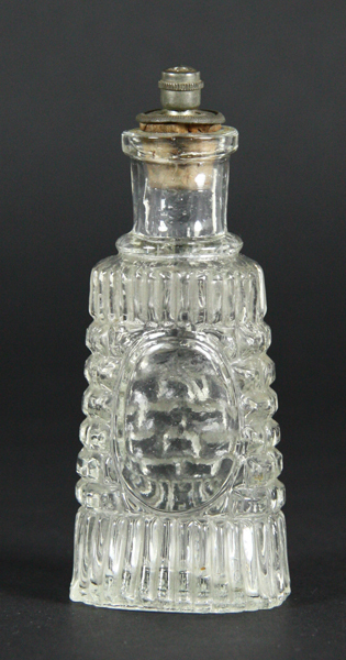 Parfumfles met dop, taps toelopend en aan de onderzijde in reliëf versierd met steenvormen en verticale strepen.