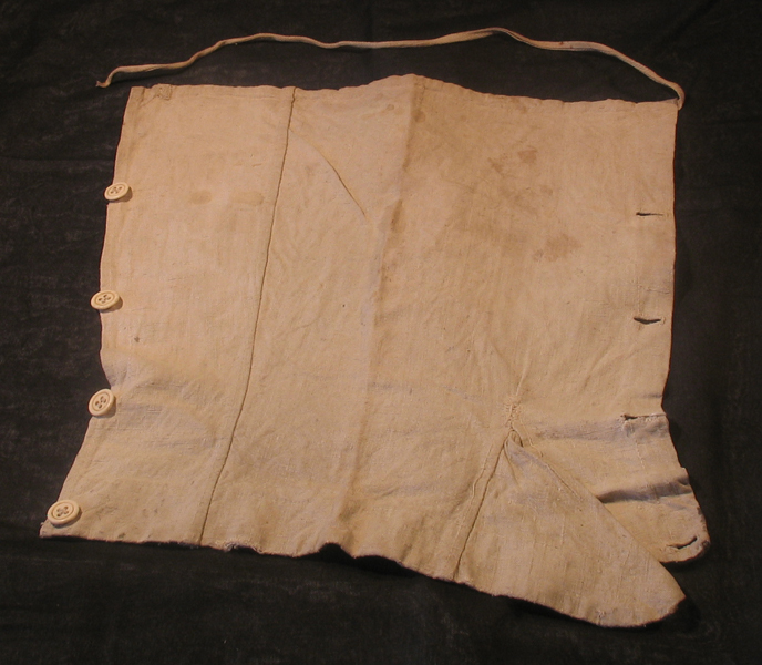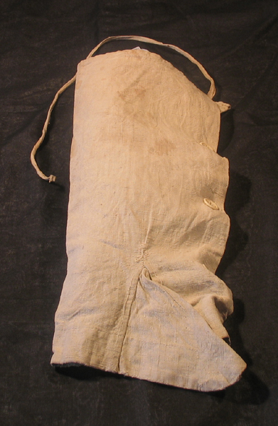 Sliklap, bruin, in twee delen, met inzetstuk voor de neus van de schoen. De overschoen sluit met vier knopen. Aan de onderkant een lint om de schoen vast te strikken. [Beschrijving is; volgens overlevering anno 2006, JdL]