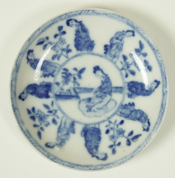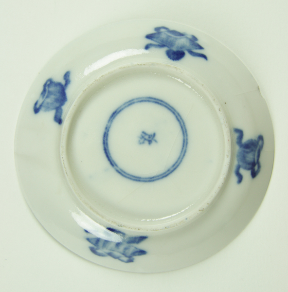 Blauwwitte schotel, medaillon met zittende lijs, omgeven door zittende lijzen en vier bloemtakken