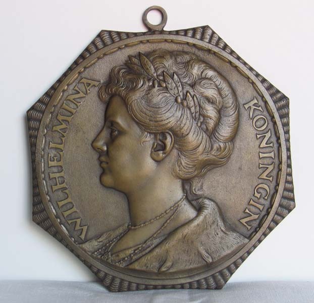 Achthoekige bronzen plaquette. Op de voorzijde een portret van koningin Wilhelmina met naar links gewend gezicht. Aan de bovenzijde een oog om de plaquette op te hangen.
