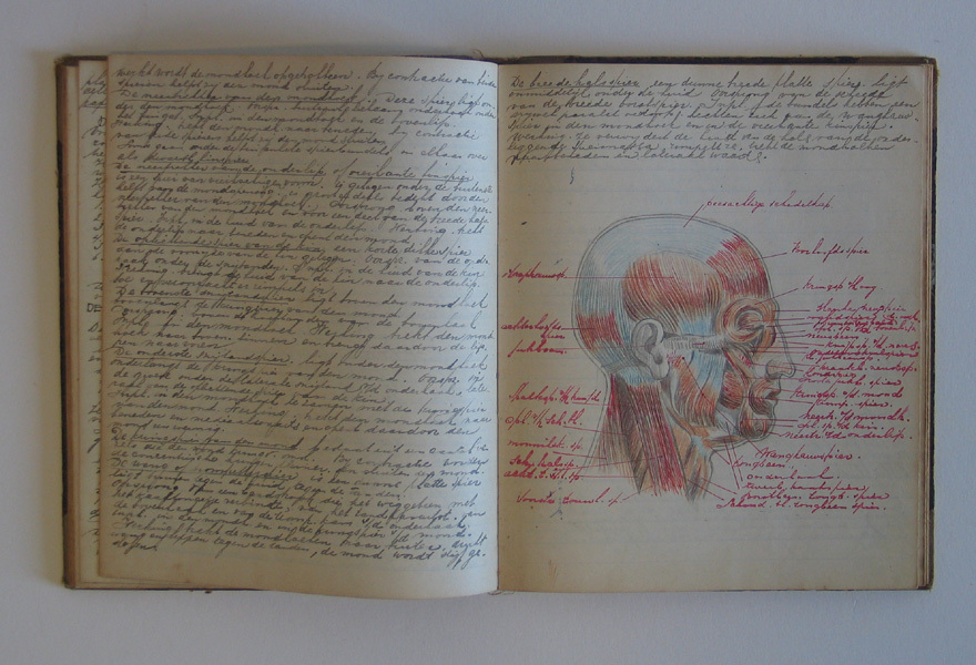 Schetsboek, roodbruine kaft met schetsen en opmerkingen over anatomie vervaardigd door M.L. Middelhoek. De andere kant van het boek is ook beschreven over: 'vragen over methodiek' .