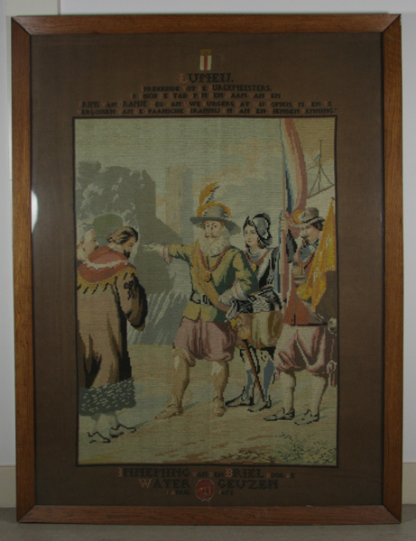 Ingelijst borduurwerk in kruissteek. Op de voorgrond drie figuren met een Nederlandse vlag. De centrale figuur wijst met zijn arm. Tegenover hem twee mannen. Op de achtergrond een toren. Om de afbeelding een bruine onbewerkte rand met boven- en onderaan opschriften. Geheel boven het wapen van Brielle. Het geheel zit in een houten lijst. Aan ...