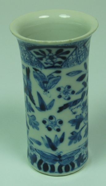 Siervaas, blauw/wit, met decor van verschillende bloemen, planten, vogels en vlinders. Bovenrand vaas voorzien van geometrische vormen onderbroken door vier bloemmotieven.