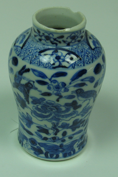 Siervaas, blauw/wit, met decor van verschillende bloemen, planten, vogels en vlinders. Bovenrand vaas voorzien van geometrische vormen onderbroken door vier bloemmotieven. Motief op siervaas vergelijkbaar met inv. nr. 5617.