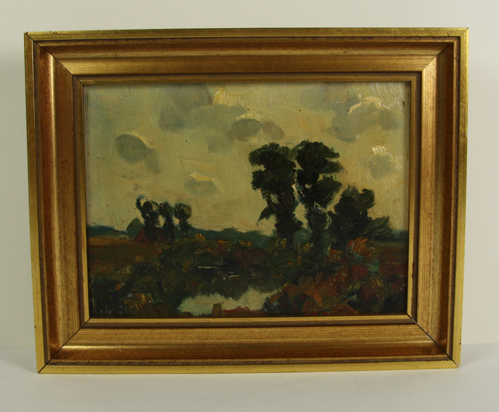 Schilderij, olieverf op paneel met voorstelling van een landschap uitgevoerd in de kleuren oker, groen en blauw. In het midden de horizon met een aantal bomen rondom een meertje of sloot. Schilderij in goudkleurige, geprofileerde lijst. Onbekend.