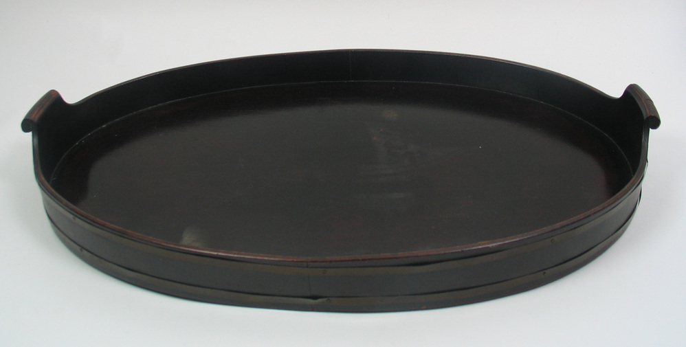 Ovaal dienblad, donkerbruin hout voorzien van twee handvaten en vier kleine pootjes aan onderzijde.