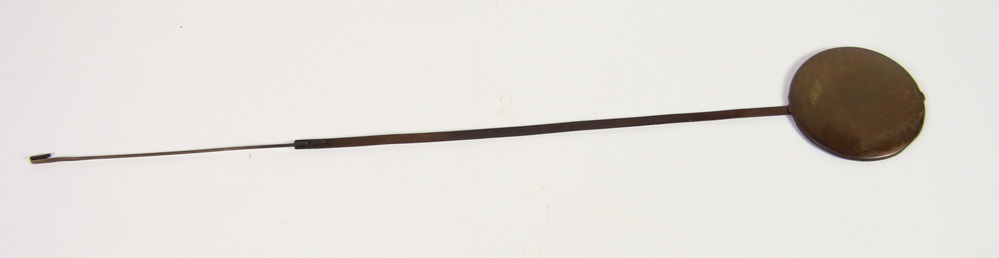 Metalen slinger van wandklok. Smalle pendel, onderaan ronde cirkel. Bovenaan haakje.