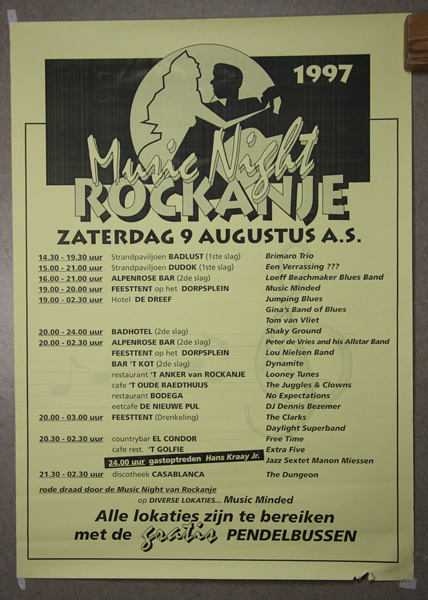 Poster op lichtgeel papier. Aankondiging van Music Night Rockanje 1997.