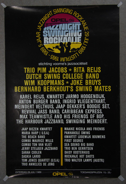 Aankondiging van Jazznight Swinging Rockanje 1989, georganiseerd door Stichting Voorne's Jazzsociëteit.